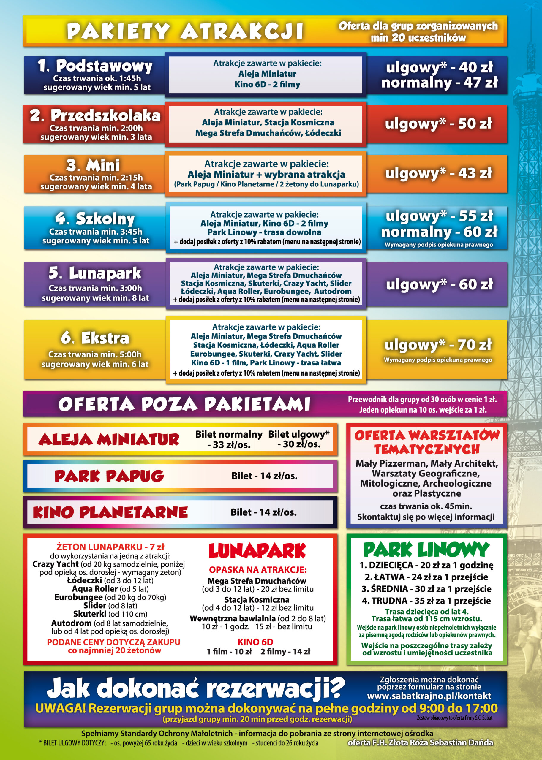 Aleja miniatur świętokrzyskich to nie jedyna godna polecenia propozycja rozrywki podczas wyjazdu. Sabat Krajno to także rozbudowany park rozrywki w świętokrzyskim. Doskonała propozycja dla całej rodziny! W naszym ośrodku spędzisz czas na nauce bądź doszkalaniu swoich umiejętności narciarskich oraz snowboardowych pod okiem wykwalifikowanych instruktorów. Nasza stacja narciarska składa się z 3 tras o różnej długości. Z pewnością każdy zarówno uczeń, jak i doświadczony narciarz spędzą na naszym stoku niezapomniane chwile. Park rozrywki w świętokrzyskim oferuje również park linowy składający się z 5 ras o różnym poziomie trudności. Pod okiem profesjonalnych instruktorów, dzieci będą miały okazję przetestowania swoich umiejętności na wysokościach. W ośrodku znajduje się także Lunapark, który jest idealną formą rozrywki dla każdego dziecka, a w nim m.in. mega strefa dmuchańców, autodrom, czy aqua zorbing. Ciekawą propozycją jest również Kino 6D, w którym turyści mogą przeżyć wyjątkowe chwile. Oprócz klasycznego obrazu 3D, podczas seansu pojawią się takie efekty, jak ruchome fale, pryskająca woda, a nawet bańki mydlane. To zdecydowanie jedna z ciekawszych propozycji w parku rozrywki, z którego korzystają goście z całego kraju, a w szczególności województwa mazowieckiego.